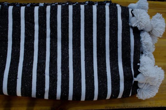 Wunderschöne handgewebte Decke aus 100 % Schafwolle (schwere Qualität) mit Pompoms aus Baumwolle als Abschluss an den Seiten.